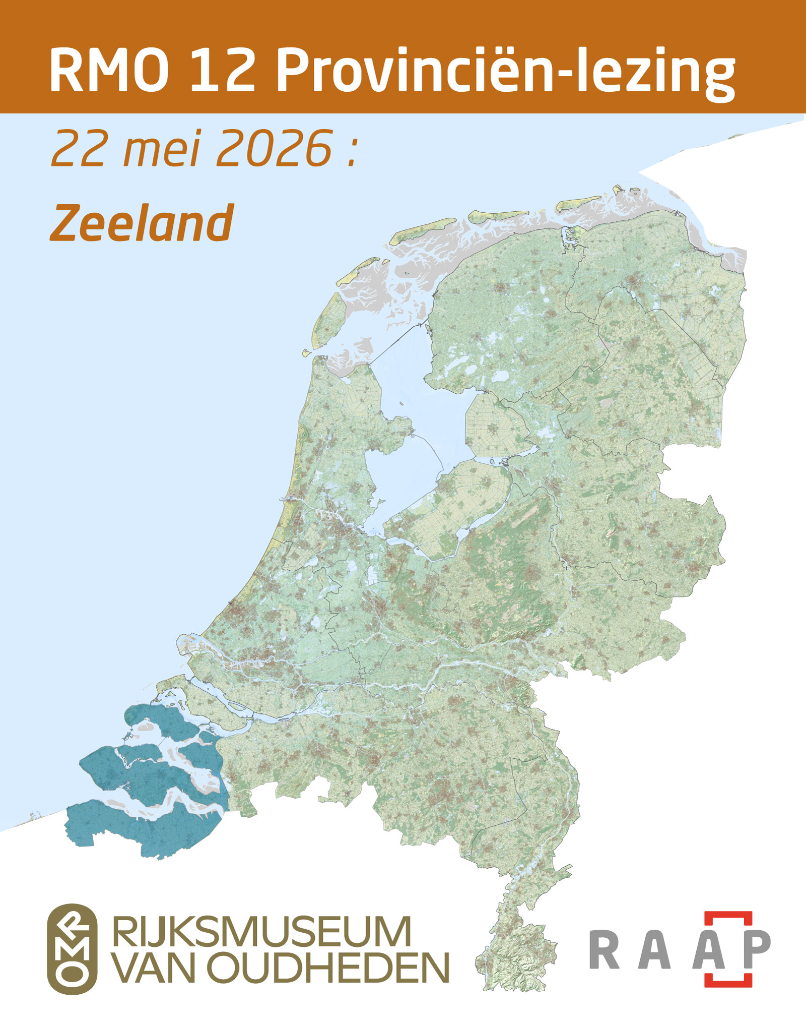 In 2025 zette het Rijksmuseum van Oudheden de archeologie van eigen bodem in het zonnetje, met onder meer de 12 Provinciën-lezingenreeks georganiseerd in samenwerking met RAAP. De serie gaat door in 2026, totdat alle twaalf provincies aan bod zijn geweest. Op vrijdag 22 mei is het de beurt aan de provincie Zeeland, met vier korte lezingen over verdronken nederzettingen in de Oosterschelde, een offerkuil uit de ijzertijd in Grijpskerke, onderzoek naar Zeeuwse ringwalburgen en honderdduizend scherven uit Goes.