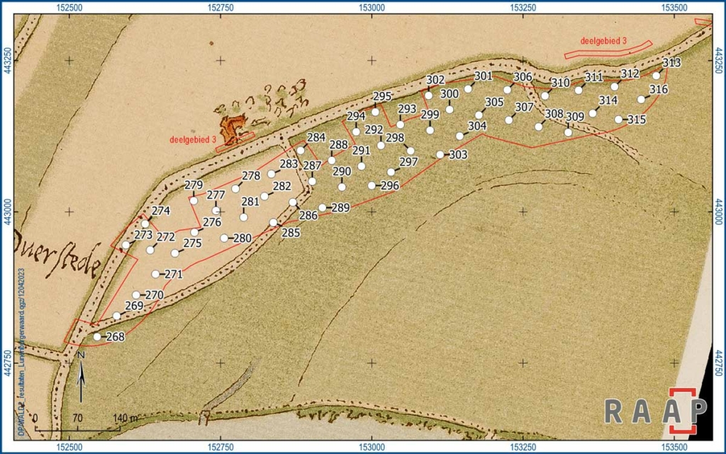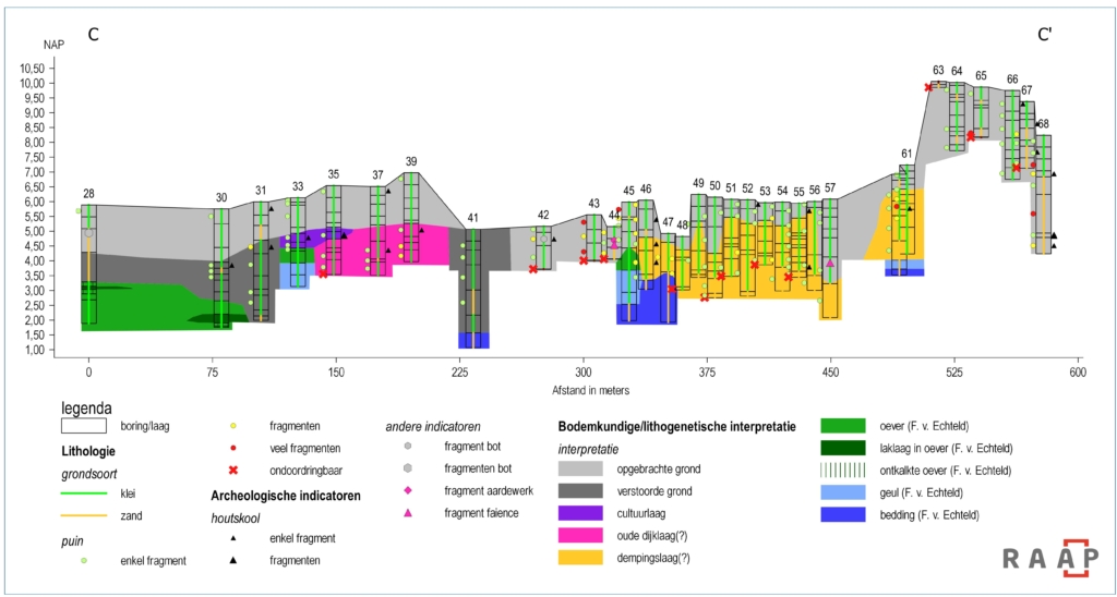 Wat treffen archeologen zoal aan in een gebied dat het water moet keren? Bij dit project onder meer aanwijzingen van oudere dijkophogingen en waterwerken. Zo zijn bij Wijk bij Duurstede resten van de oude afdamming van de Kromme Rijn gevonden. Het boorprofiel op deze locatie toont een dik pakket met lagen zand en grind. In eerste instantie was daar geen chocola te maken, zo ontbraken de geul- en oeverafzettingen die je bij een rivier verwacht. Maar na vergelijking met historische kaarten bleek het te gaan om de 900 jaar oude afdamming van de Kromme Rijn.