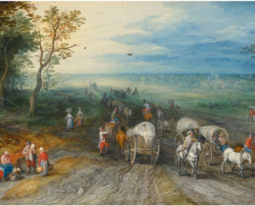 Jan Breughel. Panoramisch landschap met reizigers, karren en vee.