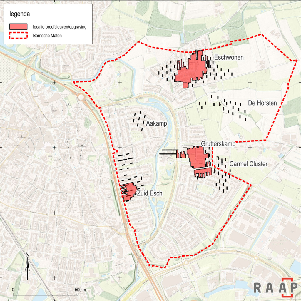 Voorafgaand aan de bouw van de wijk Bornsche Maten is in de afgelopen twintig jaar archeologisch onderzoek uitgevoerd. Drie opgravingen onder leiding van RAAP-projectleider Huub Scholte Lubberink, leverden sporen op van 33 boerderijen en 306 bijgebouwen, zoals spiekers, uit de ijzertijd en de Romeinse tijd.