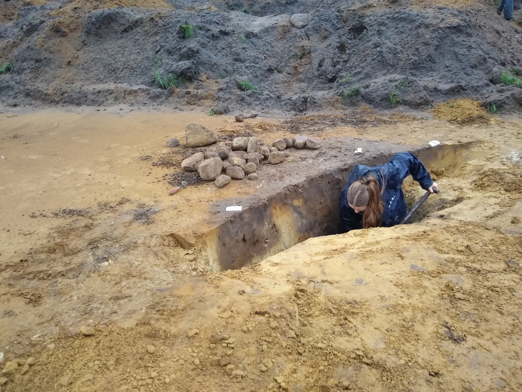 De eerste week zit er alweer op. Deze week hebben we vooral aan de zuid- en westkant van het plangebied gegraven. We zien dat in het lager gelegen gebied aan de westzijde minder sporen aanwezig zijn dan hoger op de Hondsrug. Er zijn weer haardkuilen gevonden uit het mesolithicum, en enkele spiekers uit de bronstijd of ijzertijd. Op de locatie waar de gemeente een bouwbord laat plaatsen, midden in het wegcunet van de oude Rolderstraat, zijn sporen van een huisplattegrond gevonden. Gelukkig is de bodem dus onder de oude straat nog intact en niet verstoord.
