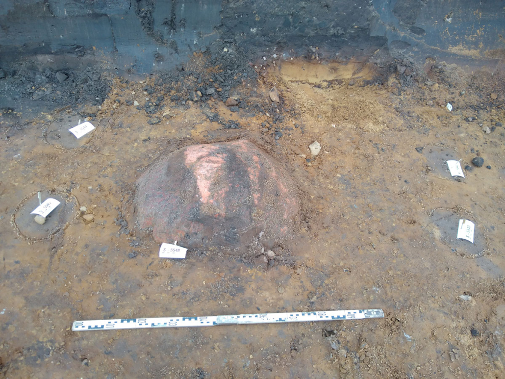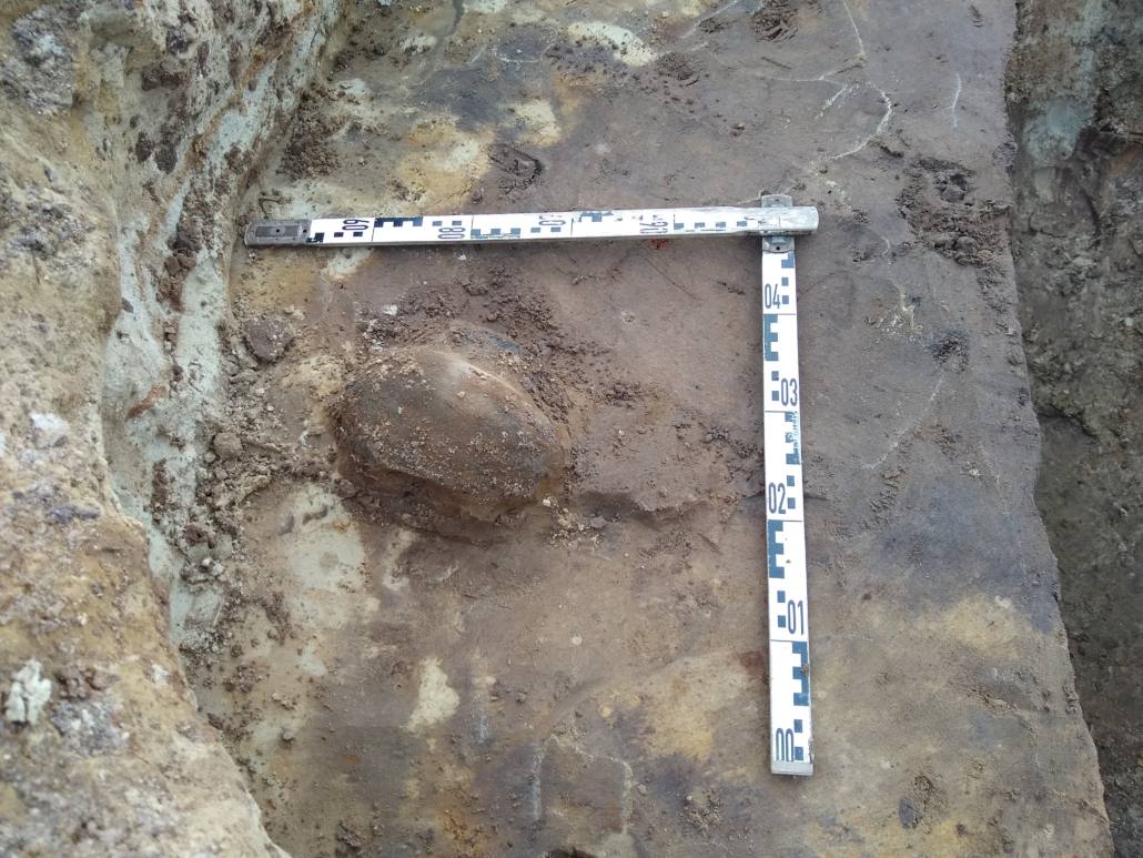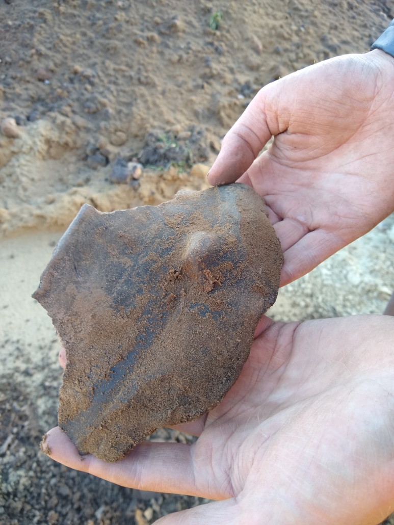 Na het jubileum weekend in Keulen zijn we maandag weer volop aan het werk gegaan. Deze week waren de weersomstandigheden wisselvallig: harde wind, regenbuien en druilerige motregen en op vrijdag eindelijk de zon. Er zijn weer heel wat meters gemaakt. Aan de zuidzijde is een wirwar aan paalsporen vrij gelegd, waarin in elk geval één complete boerderij is herkend, die richting het westen is verlengd. Deze zal uit de late bronstijd dateren. Het team aan de noordzijde heeft drie tweeschepige boerderijen op rij gedocumenteerd. Daaromheen lagen vierpalige spiekers. De tweeschepige gebouwen aan de noordzijde zijn waarschijnlijk schuren uit de vroege middeleeuwen. Dat is een periode die we nog niet eerder vonden. Er zijn veel monsters genomen, die in de nieuwe vierkante emmers goed opgeslagen worden in de container. Op de foto’s o.a. een randscherf van een pot van aardenwerk versierd met vingertop indrukken. De voortgang van de opgraving is per werkput te volgen via de webviewer.