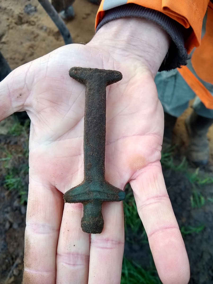 Het gaat om een handvat van een mes. Ze noemen het double T handle. Het is versierd met groeven en mogelijk ook met hele fijne versiering langs de randen. Het blad ontbreekt helaas. Het mes dateert tussen 1100 en 900 voor Chr. Het is in een kuil gevonden naast een huisplattegrond. Er zijn er slechts vier van dit type bekend in Nederland, dit is dus een zeldzame vondst. Wat het nog meer uniek maakt is dat het binnen een nederzetting is gevonden terwijl de andere vondsten uit het veen, een rivier en uit een grafheuvel afkomstig zijn. Dat we na 7 hectare uiteindelijk toch een metaalvondst uit de bronstijd gevonden hebben maakt voor ons het plaatje compleet.