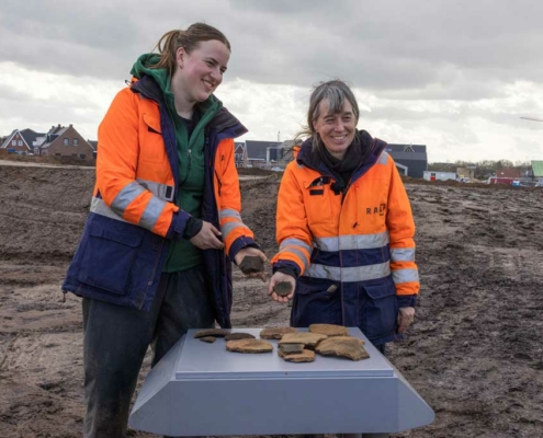 Onder de opgegraven vondsten zijn veel mooie scherven van prehistorisch aardewerk. Onder andere versierde randscherven, een randscherf met een oortje en een klein kommetje of lepeltje van aardewerk, een zogenaamde tonlöffel. In de loop van week 4 wordt de opgraving afgerond en zullen de putten weer dichtgemaakt worden.